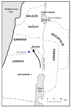 The Samaritans believed that Mount Gerizim was God’s chosen place for the temple, rather than Jerusalem. Sychar was a Samaritan city on the northern flank